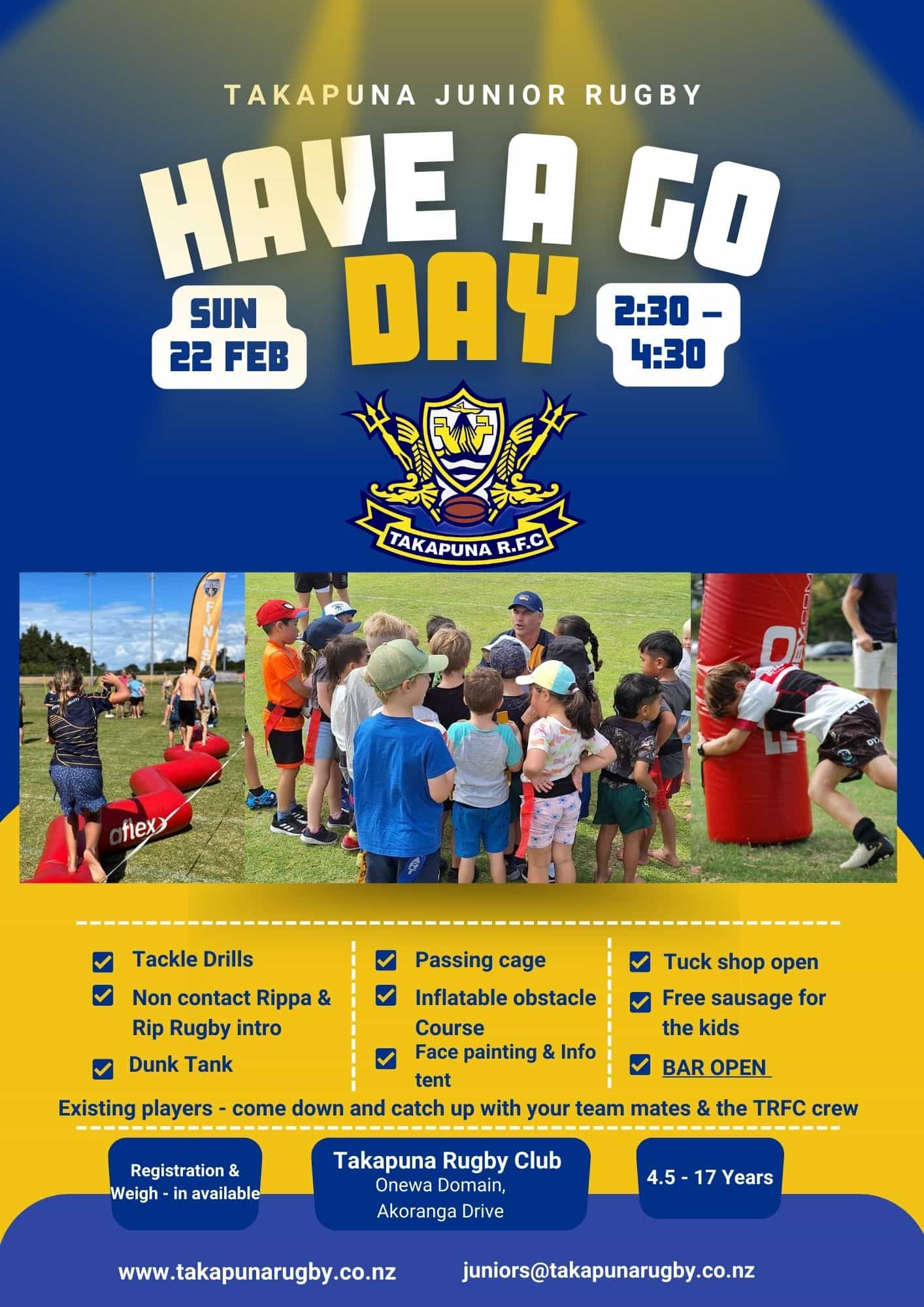 Based at Onewa Domain on Auckland’s North Shore, Takapuna Rugby Football Club has enjoyed Junior Rugby since before 1952. We have a proud tradition of providing a supportive, fun filled rugby experience for kids and their families to enjoy. It’s no surprise we have continued to grow as a club as we remain committed to delivering on our mission statement which is “to foster, organise and promote rugby and associated activities at a welcoming and family orientated club”.
